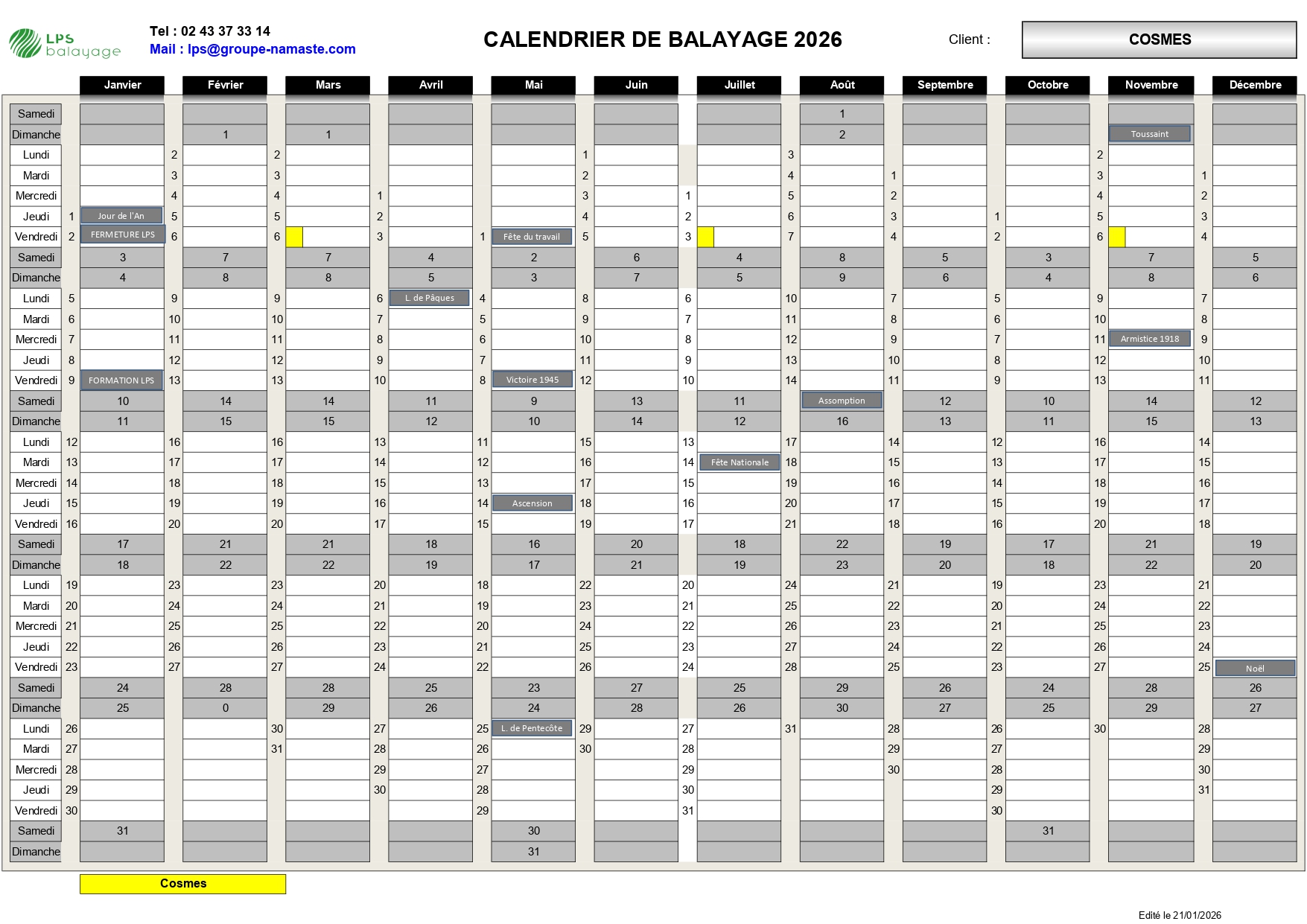 L'entreprise LPS BALAYAGE interviendra à Cosmes trois fois dans l'année (voir calendrier joint) pour procéder au balayage des rues du bourg (rue Principale, rue de l'Eglise et rue de la Fontaine). La prochaine intervention aura lieu le vendredi 6 mars prochain. A cette occasion, nous demandons aux habitants ayant des véhicules stationnés dans ces rues de bien vouloir les déplacer sur le parking, pour permettre le passage de la balayeuse. Merci par avance.
